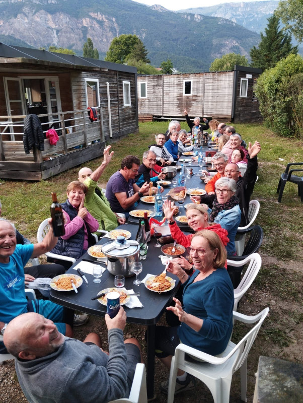 Week-end Spiridon à Châtillon en Diois, ambiance conviviale au camping du lac bleu, pasta party et bonne ambiance avant les épreuves du dimanche.
